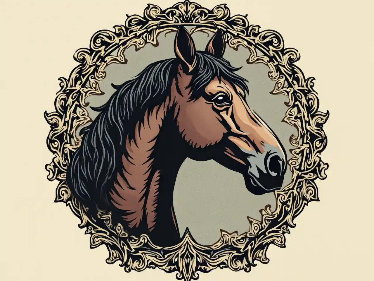 رأس الحصان مكتوب على الجانب ، والخلفية هي نمط القوطية