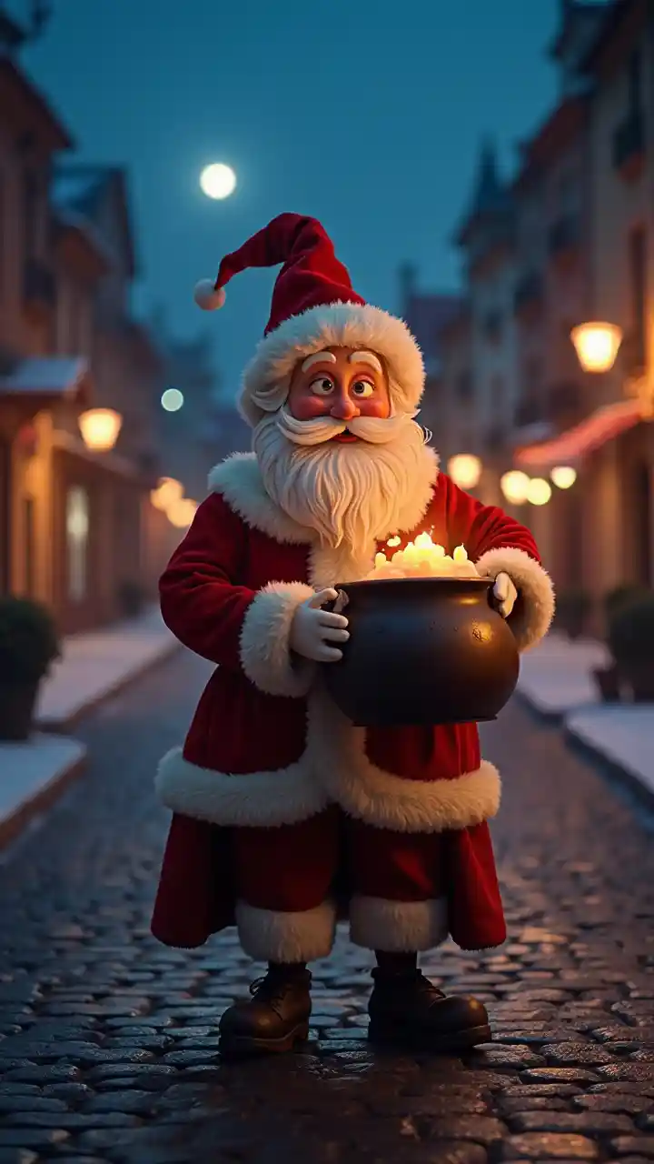 سانتا كلوز الساحرة في وسط شارع الليل ، موضوع هالوين ، على غرار ديزني بيكسار ، يرتدي قبعة مستدقة ويحمل مرجل الفقاعات