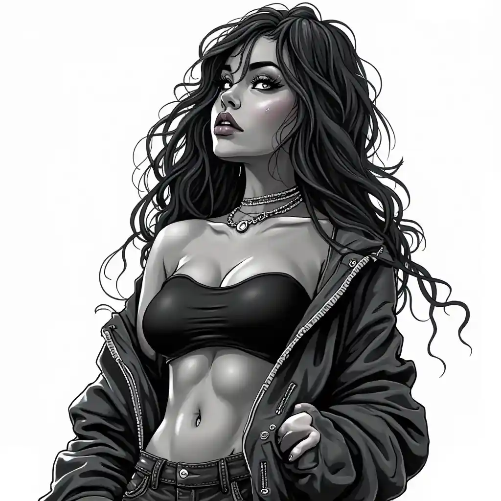 رسم نسائي بالأبيض والأسود ، ثقافة الهيب هوب ، فن كوميدي ، استخدام ظلال الضوء والظلام ، نسب مبالغ فيها عملاقة