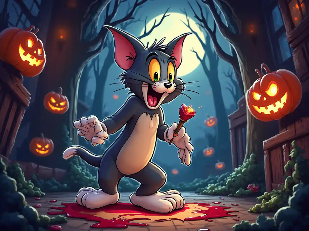 توم وجيري ، الرسوم المتحركة ، مشهد الرعب ، أسلوب هالوين ، ألوان مشبعة حية ، تفاصيل عالية ، تباين عالي