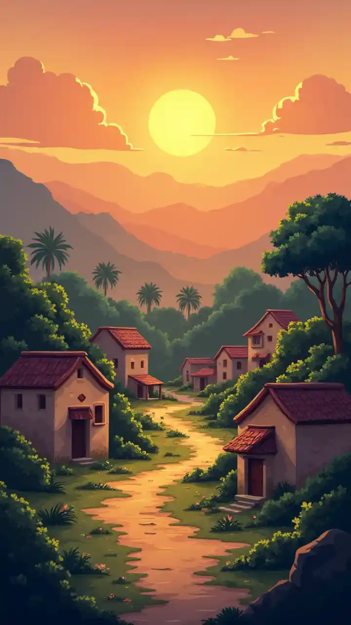 Sawyerمنظر كرتوني للقرية الهندية مع المنازل والأشجار عند شروق الشمس.
