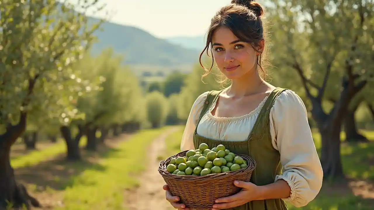صورة لفتاة إيطالية شابة داكنة وجميلة تزرع الزيتون الأخضر من صقلية في القرن السابع عشر ، يرتدي المزارعون الشعبيون الإيطاليون ثديين منخفضين ، وأضواء درامية ، وعمق المجال ، وأشكال واضحة ومحددة بشكل منتظم من بساتين الزيتون في الخلفية. يجب أن يكون للزيتون بنية جميلة ومتجانسة. الرسوم التوضيحية بالألوان المائية ذات التفاصيل العالية بشكل لا يصدق. امسك سلة من الزيتون في يدك ، سلة من الخوص ذات الملمس الصحيح ، ضع الزيتون في سلة ذات الملمس الصحيح مع التوت الجميل.