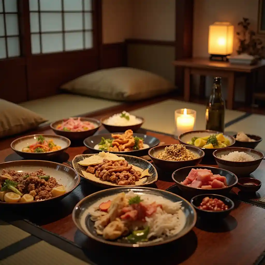 Oliverصور رومانسية مريحة للغاية ، عشاء مزدوج ياباني تقليدي. المقاعد على الأرض. الكثير والكثير من الأطباق ، طاولة كاملة. الأطباق الباردة والدافئة. الساكي. البيئة التقليدية اليابانية.