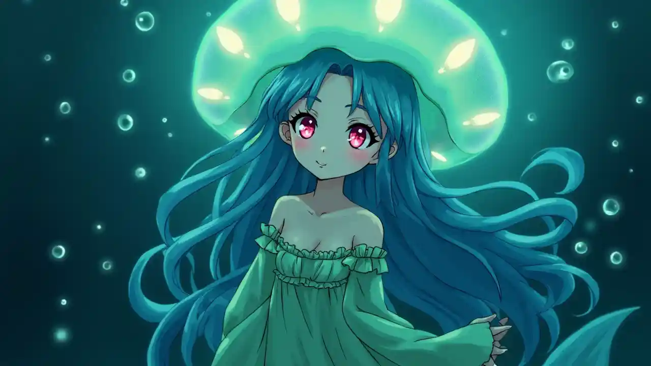 فتاة قنديل البحر الأثيرية مع قبعة مضيئة بيولوجيًا
