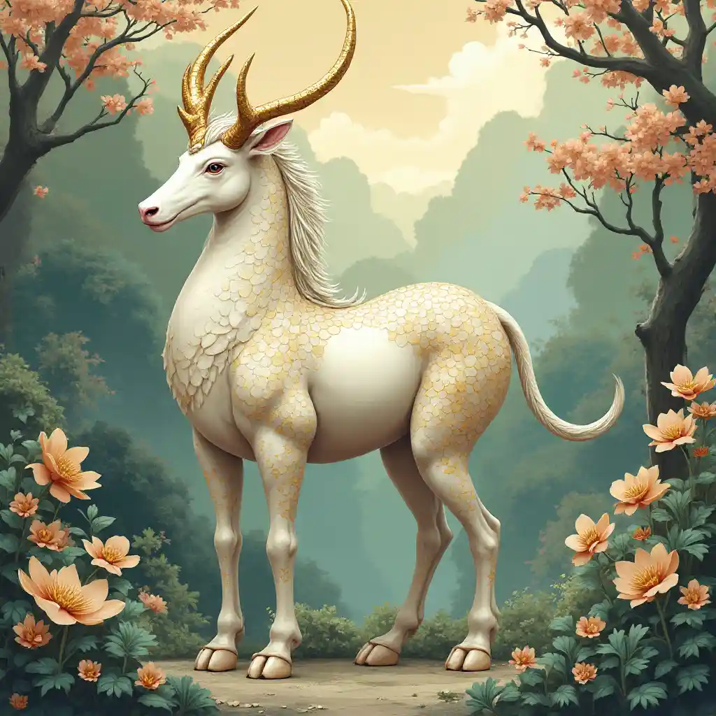 في تصوير هادئ ومهيب ، تقف كيرين يابانية في غابة خصبة نابضة بالحياة ، مع قشور متلألئة من الذهب والفضة والألوان البيضاء على جسم غزلان نحيف ، مما يثير شعوراً بالنقاء والجمال. ينحدر ذيلها الشبيه بالماشية إلى أسفل ، في حين أن رأسها المستوحى من التنين يحمل زاوية منحنية إلى الوراء تذكرنا باليونيكورن. المخلوق اللطيف يتلألأ في عينيه الحكمة واللطف ، وبشرته متألقة ، وبشرته كالبورسلين. تنجرف الغيوم الرقيقة الأثيرية تقريبًا حول جسدها ، مما يؤكد على طبيعتها الخارقة عن المألوف. كان الجو هادئًا ، وكان حضور كيرين القوي والرحيم واضحًا. في الخلفية ، يتم دمج العمارة اليابانية التقليدية وتلميحات أوراق الشجر بشكل متناغم ، مما يعزز جذور المخلوق في الأساطير اليابانية. الجماليات الشاملة هي عظمة منخفضة المستوى ، وضربات جريئة ومعبرة ، وتفاصيل معقدة تدعو المشاهد إلى الدخول في هذا المجال الساحر.