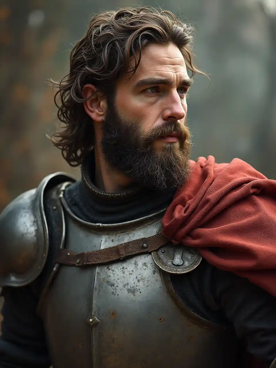صورة فارس قوي البنية من العصور الوسطى ، بدون خوذة ، لطيفة ، وسيم