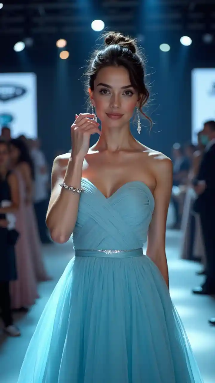 صورة لسيدة عارضة أزياء شابة بفستان سهرة منفوش بلا أكمام باللون الأزرق الفاتح. يحتوي الفستان على خط عنق مكشوف قليلاً وزخارف خفية بالقرب من الكتفين. تقف ، تلمس خدها بلطف بيد واحدة ، وتخلق الحرف C. وضعيتها أنيقة ومرحة ، وعينها اليسرى مغلقة ، كما لو كانت تغمز للجمهور. كانت ترتدي سوار على أحد معصميها. في الخلفية ، هناك مجموعة عرض سيارات ، وقاعة إضاءة كبيرة ومشرقة مع مجموعة متنوعة من الأضواء والشعارات التي يمكن رؤيتها. الجو العام رائع ويشعر وكأنه معرض سيارات رسمي ؛ مزاج هادئ ولكن نابض بالحياة ، مع مزيج من الأناقة (اللباس من العارضات) والإثارة في معرض السيارات. تعمل مجموعات الإضاءة الخافتة والأضواء الساطعة على تعزيز الشعور بالنشاط المستمر.