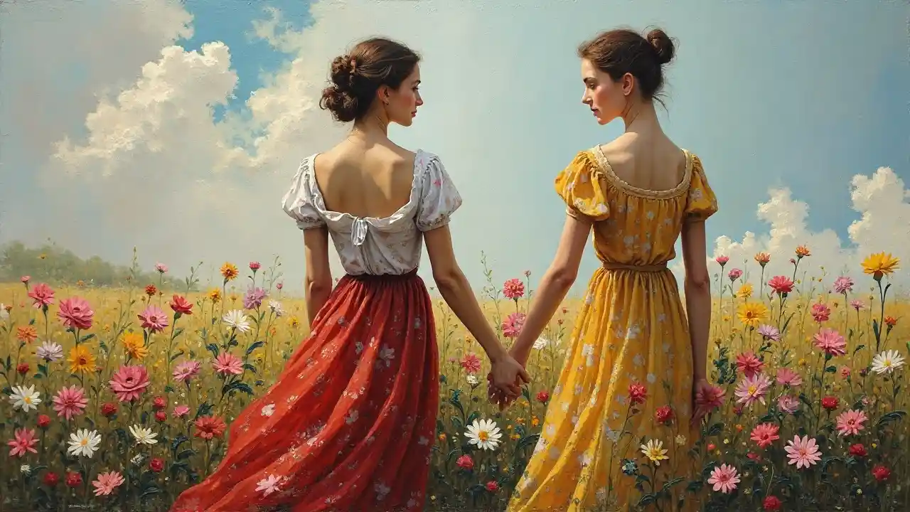 الرسم الزيتي امرأتان gezien vanaf de acherkant ، moeder en dochter ، يدا بيد … bloemen