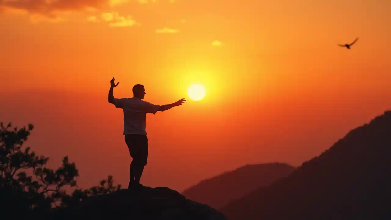 Jonathanرجل يلعب تاي تشي على الجبل في مواجهة البرتقالي الأصفر في المساء ، مع صورة ظلية من الحمام في السماء ، وصورة ظلية من الأشجار على الجبل