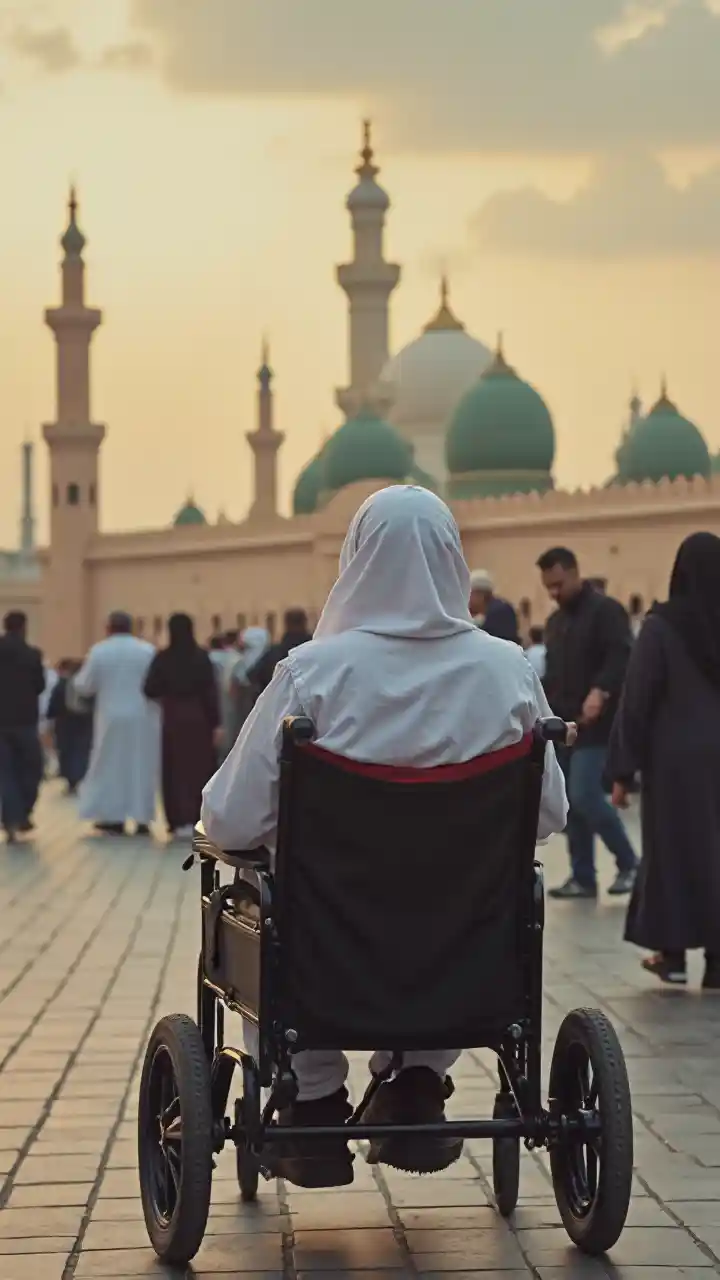 شاب مسلم على كرسي متحرك يتقدم نحو المدينة المنورة مقطع بوستر