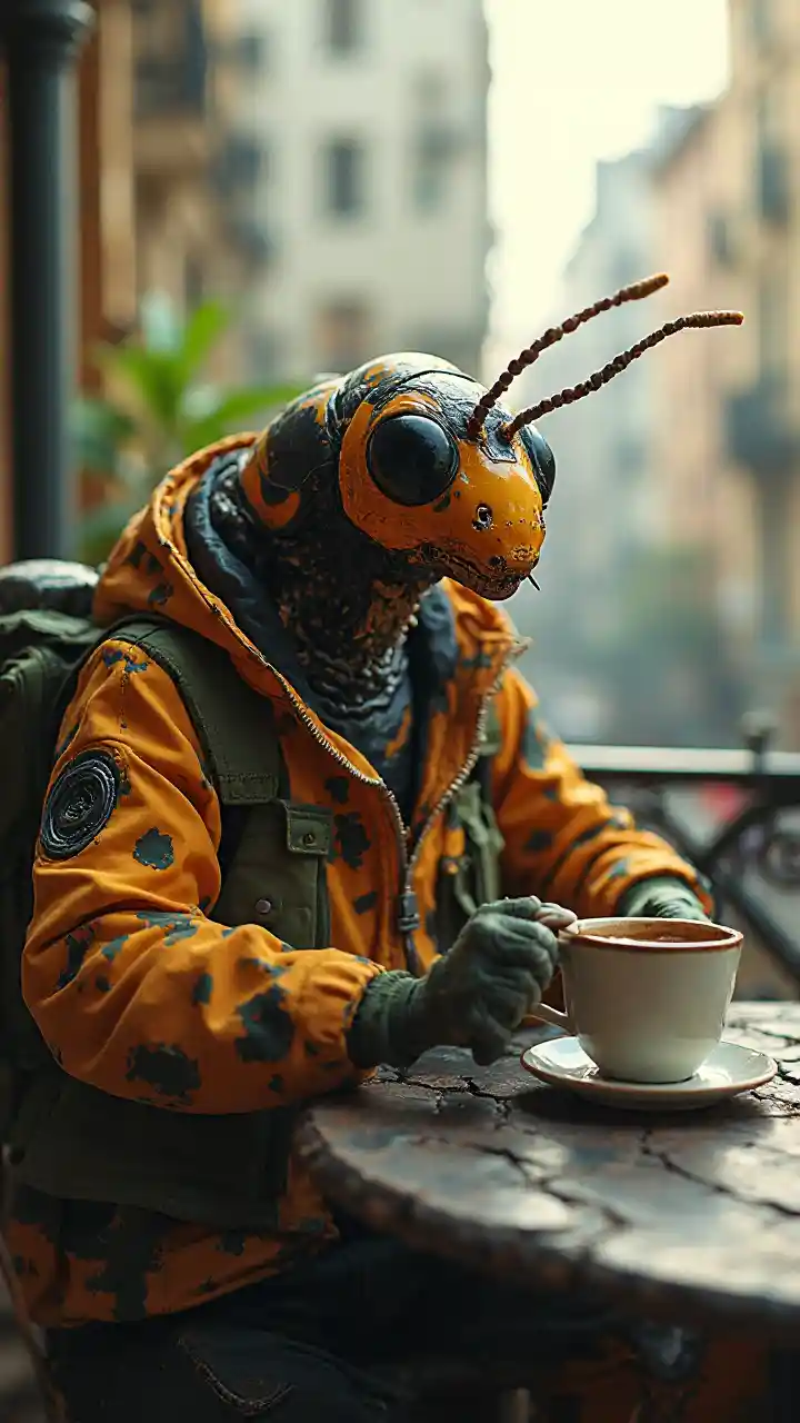 حشرة متحولة ترتدي معطفا مموها لشرب شاي الصباح على التراس