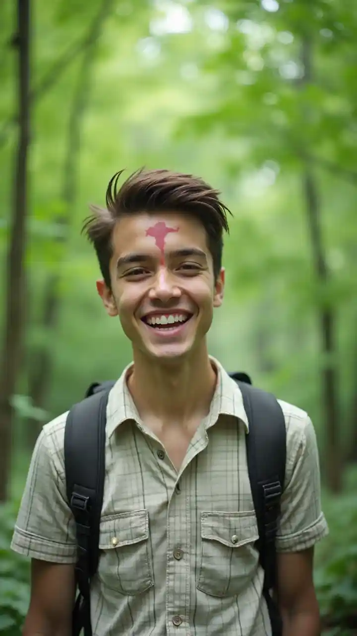 يقف في غابة خصبة وخضراء ، شاب يبتسم بابتسامة دافئة ، يشع سحر الوصول. كان يرتدي قميصا منقوشا خفيفا ويحمل حقيبة ظهر ، مما يشير إلى نزهة غير رسمية أو مغامرة. كان تصفيف شعره أنيقًا ، وكانت هناك علامة حمراء صغيرة على جبهته تضيف لمسة ثقافية إلى مظهره. الخلفية منقوشة بالأشجار الغامضة ، مما يشير إلى بيئة هادئة في الهواء الطلق تنقل الهدوء والاتصال بالطبيعة ، ويتم تعزيزها بشكل أكبر من خلال الأضواء الناعمة المنتشرة التي تثير الشعور بالهدوء. المزاج العام مبتهج ومغري ، ويلمح إلى متعة الاستكشاف والجمال المحيط.