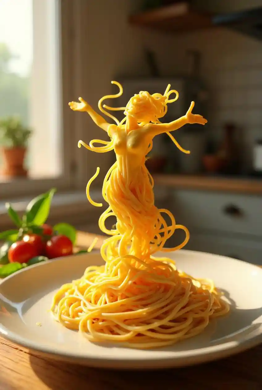 تشكل المعكرونة ثلاثية الأبعاد فائقة الواقعية رقصة ديناميكية على لوح خزفي أبيض. يتم ترتيب المعكرونة بذكاء ، مما يخلق صورة ظلية لذراعين مفتوحين لشخص ما ، كما لو كان يتجمد ويدور في المنتصف. تتشابك خطوط السباغيتي الذهبية معًا لتشكيل الجسم ، وتخلق النهايات الفضفاضة إحساسًا بالحركة والتنقل. توضع الأطباق على طاولة خشبية في مطبخ دافئ ومشمس. تشمل العناصر المحيطة أوراق الريحان الطازجة ، وفاكهة العذراء ، وأدوات المطبخ غير المركزة قليلاً في الخلفية. تؤكد أضواء الفيلم على الظلال الذهبية للمعكرونة وتخلق ظلال خفية. دقة فائقة مع نسيج واقعي ، مما يدل على خطوط المعكرونة الفردية والصقيل من الأطباق. يعزز تصنيف الألوان الجو الدافئ والجذاب لمطبخ الأسرة. " تحتوي هذه النصيحة على العناصر الرئيسية التي طلبتها: دمية وجه ترقص على طبق تأثيرات بصرية فائقة الواقعية ديناميكي إعدادات المطبخ للسياق