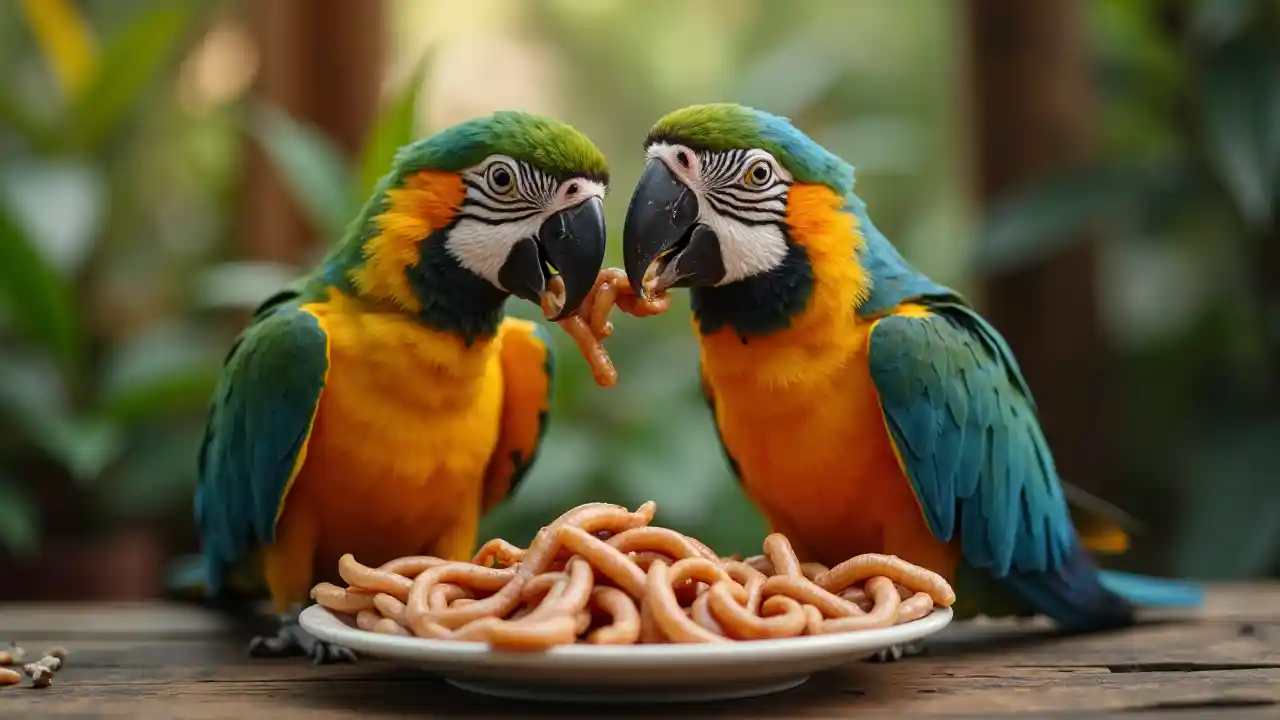 اثنين من الببغاوات الملونة تأكل عشاء رومانسي في قفص ، وتناول طبق من الحشرات العادية ، وأنها تأكل نفس النوع من الحشرات