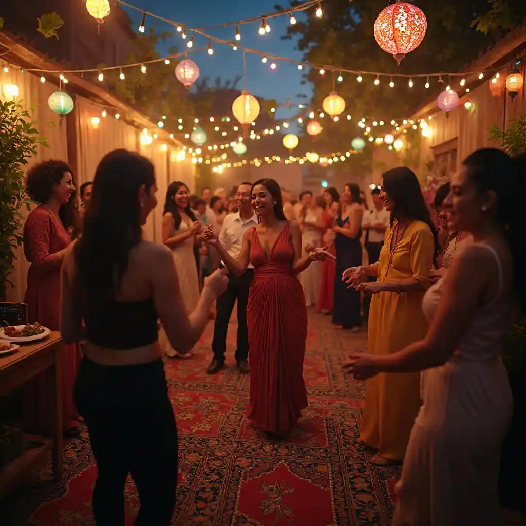 نصائح: أحزاب إيرانية نابضة بالفرح والحيوية. ويرقص الضيوف بحماس على الموسيقى الإيرانية المبهجة تحت مظلة الأضواء الوترية والملونة. يجمع هذا المشهد بين العناصر الحديثة والتقليدية - يرتدي الناس ملابس أنيقة على الطراز الفارسي ، بعضها عصري وبعضها تقليدي. كشك دي جي مليء بالمعدات المضيئة ، ومنضدة قريبة مليئة بالمكسرات والفواكه والحلويات وغيرها من المأكولات الفارسية. كانت الأجواء دافئة والضيوف يصفقون ويضحكون ويستمتعون بالأجواء الاحتفالية. تعرض الخلفية السجاد الفارسي والبلاط المزخرف والأضواء الدافئة التي تضيف مزاجًا مريحًا ومثيرًا.