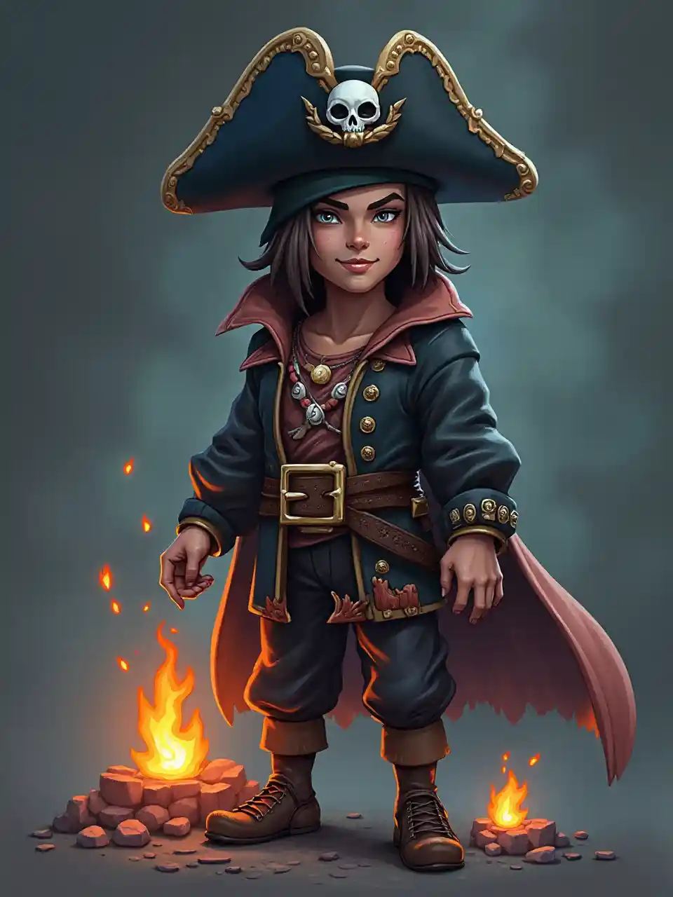 Milaلاعب مع هذا النوع من الجلد filhotegamerofc شخصية قرصان يرتدي قبعة سوداء ، جمجمة بيضاء ، يرتدي حزام بني. بالقرب من النار ، مع بلورة