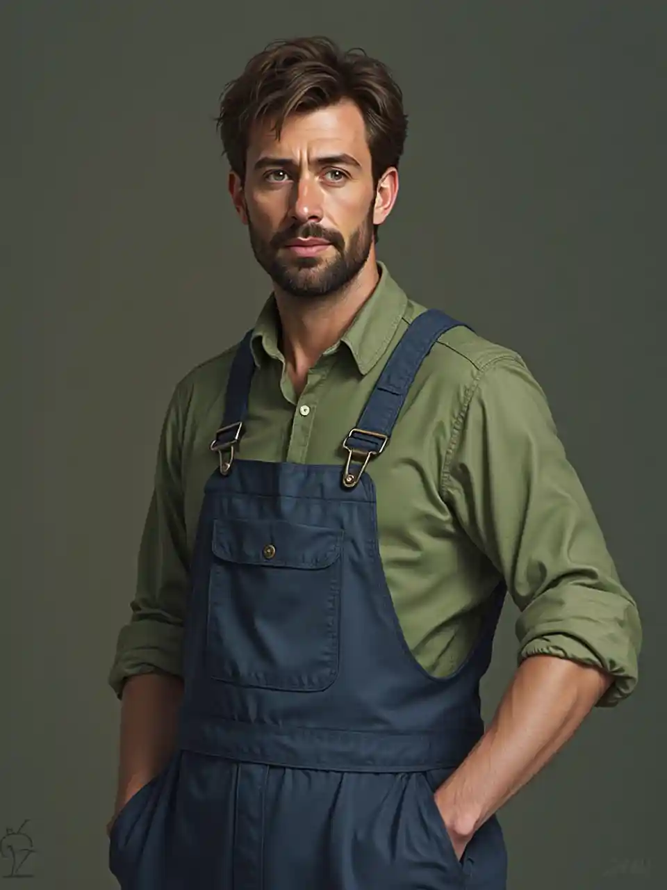 صورة واقعية لرجل يرتدي قميصا أخضر وزرة عمل زرقاء.
