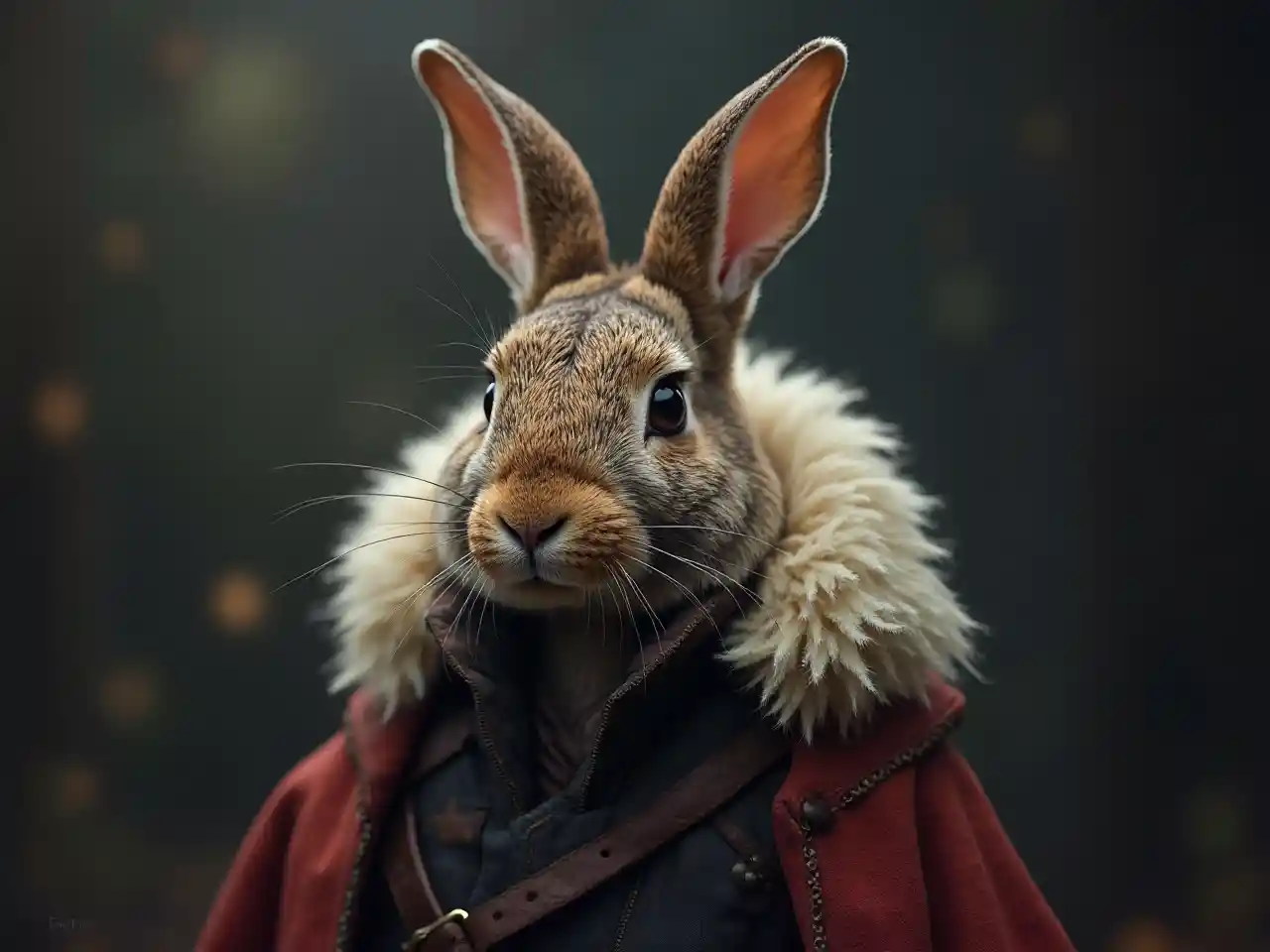 Laylaصورة أرنب في معطف من جلد القارب ، التفاصيل ، التفاصيل المركزة ، الغلاف الجوي العميق ، صورة واقعية