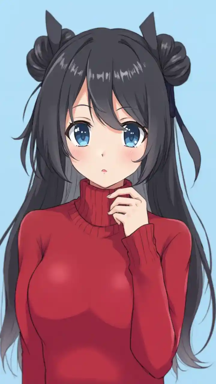 1girl,Tohsaka rin,solo,long hair,sweet,red sweet,looking at viewer,blue background,black hair,simple background,two sides up,highleneck,blue eyes,lips,closed mouth,ribbbon,hair ribbon,bangs,highleneck sweet,upper body,parted bangs,black ribbbon,