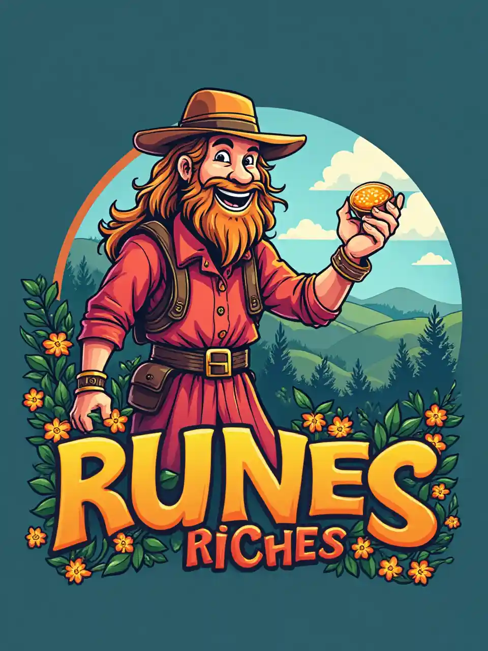 لافتة ذات مناظر طبيعية ، موجودة في اليد اليسرى ؛ رجل كرتوني ، يرتدي قبعة ، شعر طويل ، مع رونية ، يظهر الثراء ، يبتسم ، يرتدي ملابس زاهية ، موجود في اليد اليمنى ؛ RUNE RICHES ، بألوان زاهية
