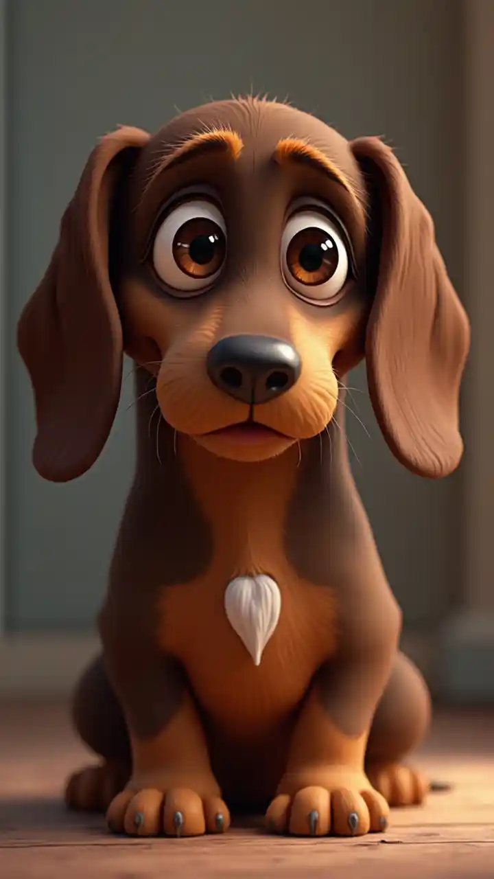 كلب شوكولاتة بني شوكولاتة حزينة مع عيون كبيرة بنية حزينة ، وآذان ناعمة ، وصدر أبيض ، وأسلوب مع شخصيات من أفلام بيكسار.