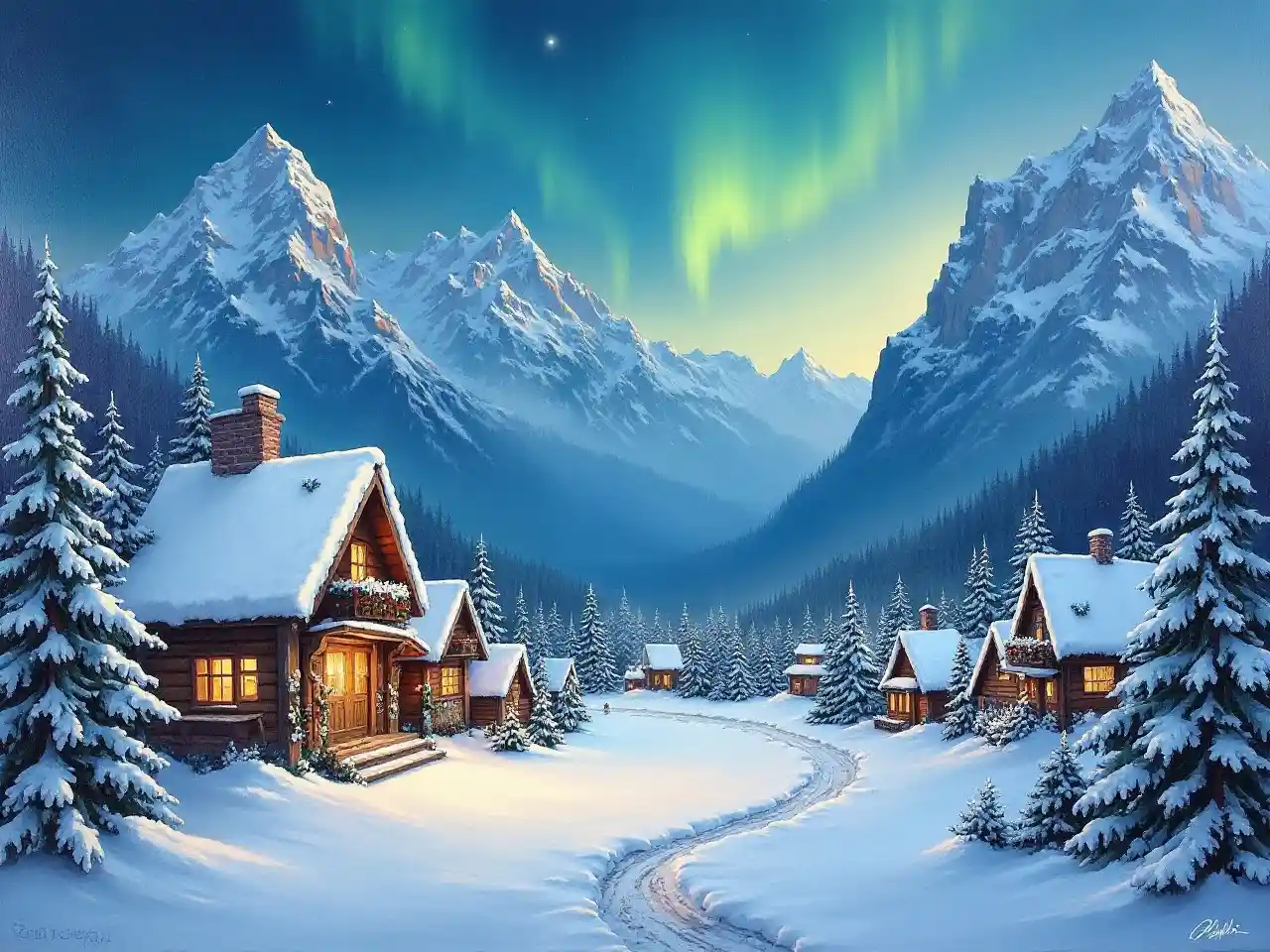 Owenقرية ساحرة مغطاة بالثلوج تتربص بالجبال ، وورش سانتا مرتفعة ، وتحيط بها أكواخ عتيقة ، والشفق القطبي يتراقص في السماء ، والهواء مليء بنوع من الدهشة والترقب ، واللوحات ، واللوحات الزيتية على القماش ،