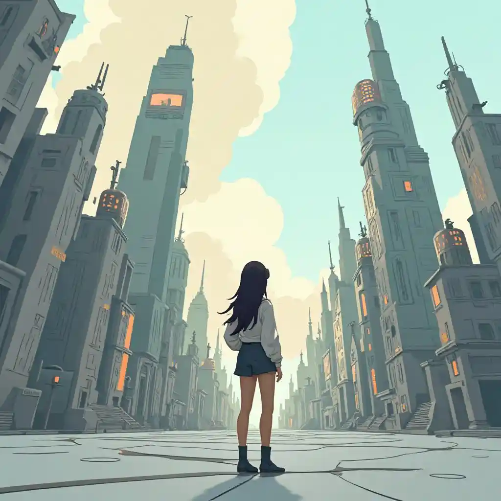 A three-dimensional realistic woman standing in front of a simple illustration of a two-dimensional sci-fi city