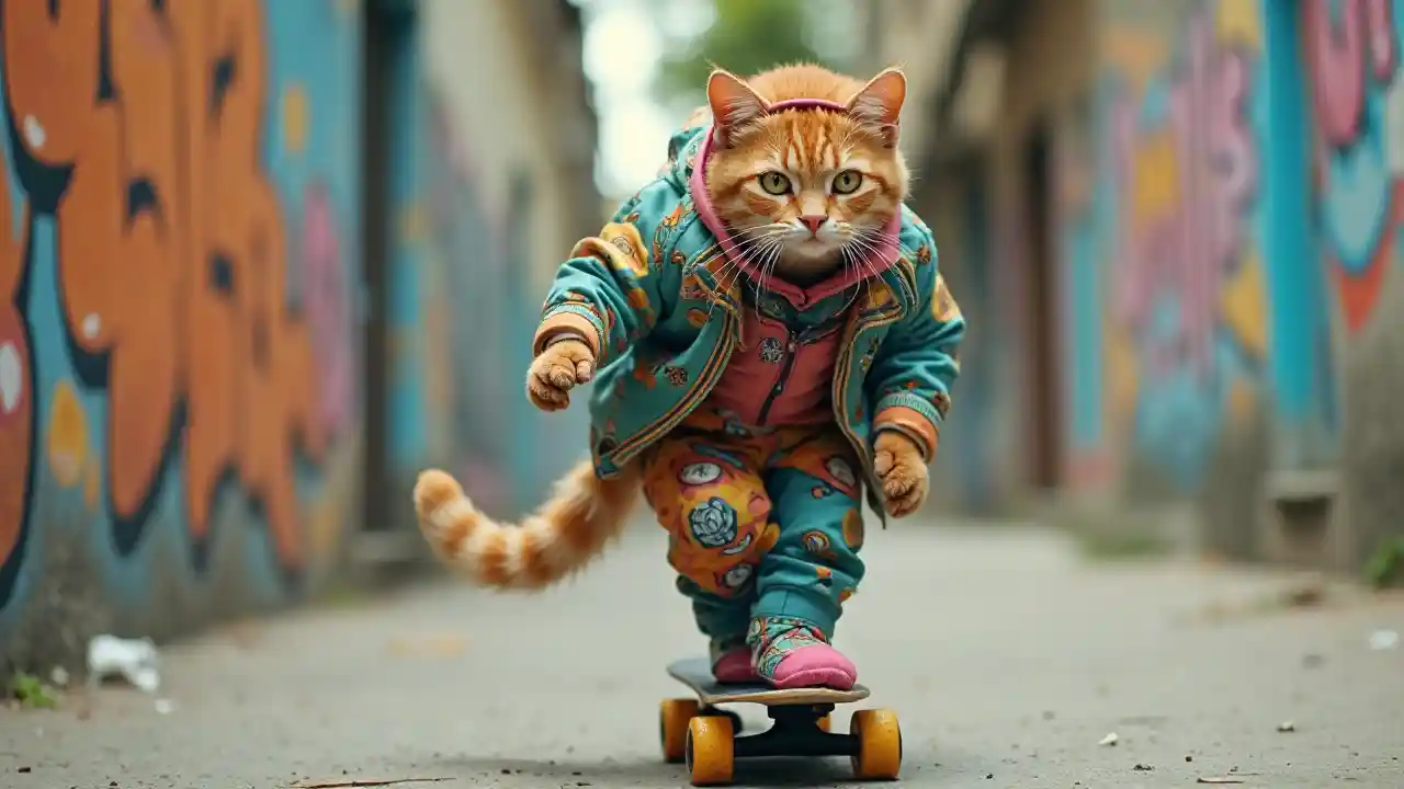 Um gato andando de skate usando roupas coloridas,um cen á rio com grafites