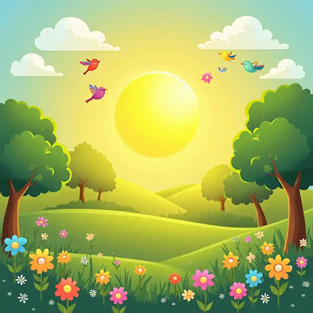 مشهد طبيعي كرتوني عند شروق الشمس ، تشرق الشمس الصفراء الكبيرة ، تزقزق الطيور متعددة الألوان ، تتمايل الأشجار بلطف في مهب الريح ، تتفتح الابتسامات على العشب الأخضر ، تضيء كتب الأطفال بألوان زاهية ومبهجة