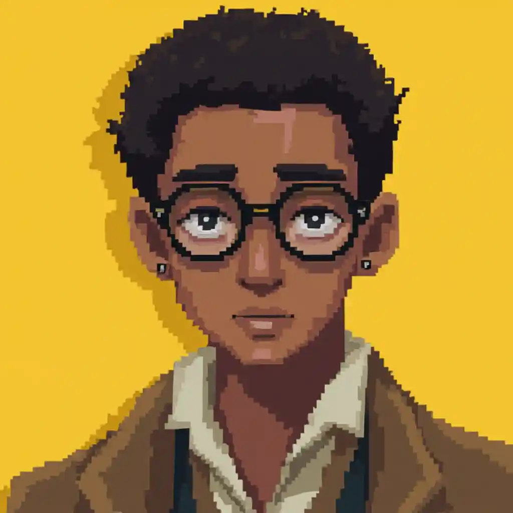 NFT pixel potrait, Thomas Shelby looks, بشرة بنية فاتحة, استخدام النظارات, خلفية صلبة صفراء