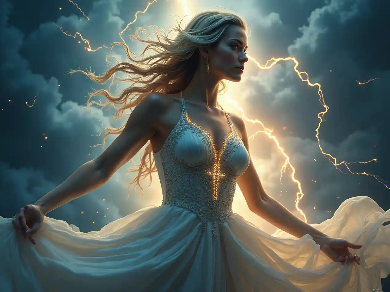 صورة وجه ((Thundersky of Radiance)) ، إلهة قوية وغامضة للبرق والكهرباء والسحب العاصفة ، تجسد جوهر تصادم القوى في الطبيعة ، وتظهر القوة والأناقة بشكل دراماتيكي. كان جسدها رياضياً ومنسخاً ، مع تماثيل شخصية مزينة بنقوش معقدة تحاكي الرقص الحلزوني للرعد والكهرباء ، مما يلقي ضوءاً أثيرياً حولها. (صاعقة الرعد والقطرات طبقة تلو الأخرى في الهواء) يخلق خلفية رائعة من العجائب الطبيعية التي تتناقض بشكل جميل مع الأناقة الرائعة للموقع. التفاعل بين الضوء والظل ، والألوان الزاهية للفستان ، والهالة الغامضة التي تغلف شكلها ، كل ذلك يضيف إلى الصورة جوًا خارجًا عن المألوف.