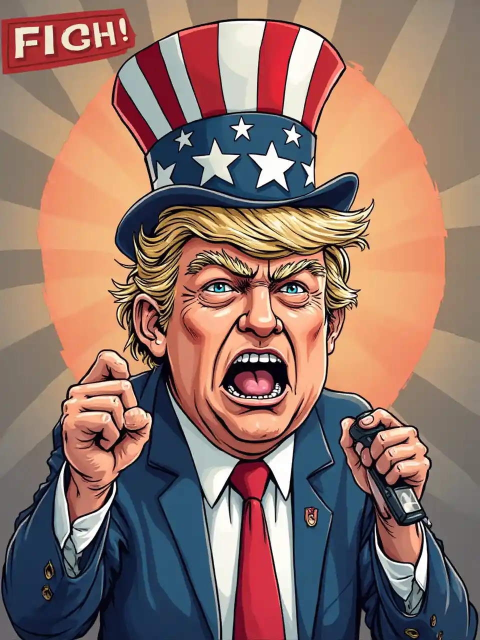 رسم كاريكاتير لدونالد ترامب يرتدي قبعة من النجوم والأعلام ، بعد أن كتب عليه "قتال!" رفع قبضته تحت اللافتة والصراخ