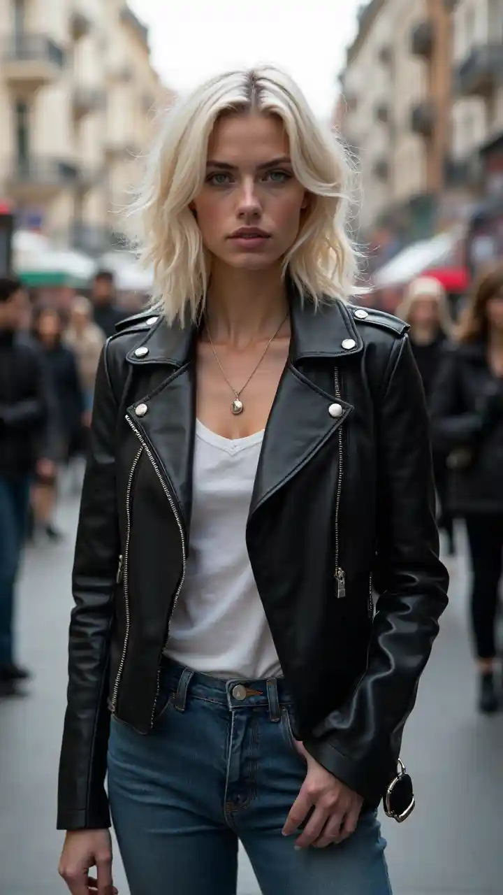 تخيل امرأة ذات بشرة بيضاء وشعر أشقر من البلاتين ، ترتدي سترة جلدية سوداء جريئة وسروال جينز ضيق ، تقف في وسط شوارع المدينة المزدحمة. تحيط بها الحياة الحضرية الصاخبة ، لكن وضعيتها الواثقة تجعلها تبرز.