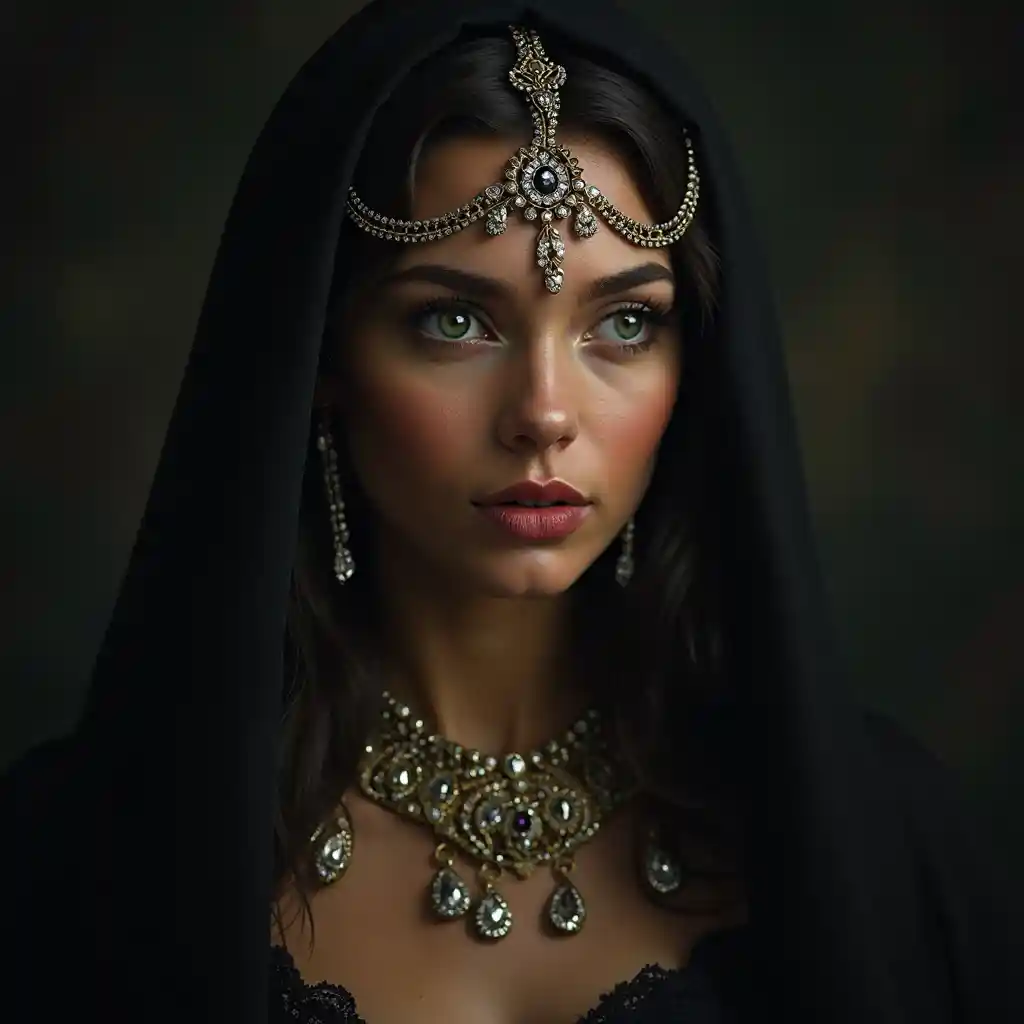 امرأة ذات بشرة داكنة ، وعينين أخضر ممتلئتين ، وشفاه حمراء مع حجاب أسود ، ومعدن ذهبي رائع وحلي وقلادات من الماس ، وخلفية مظلمة ، ومزاجية