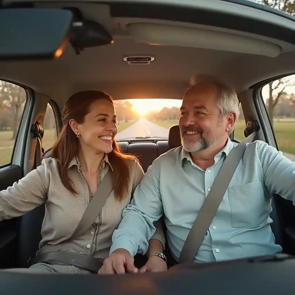 رجل وامرأة يقودان السيارة ويرحبان بالجميع في الاحتفال بذكرى زواجهما (يبلغان من العمر 36 عاما)
