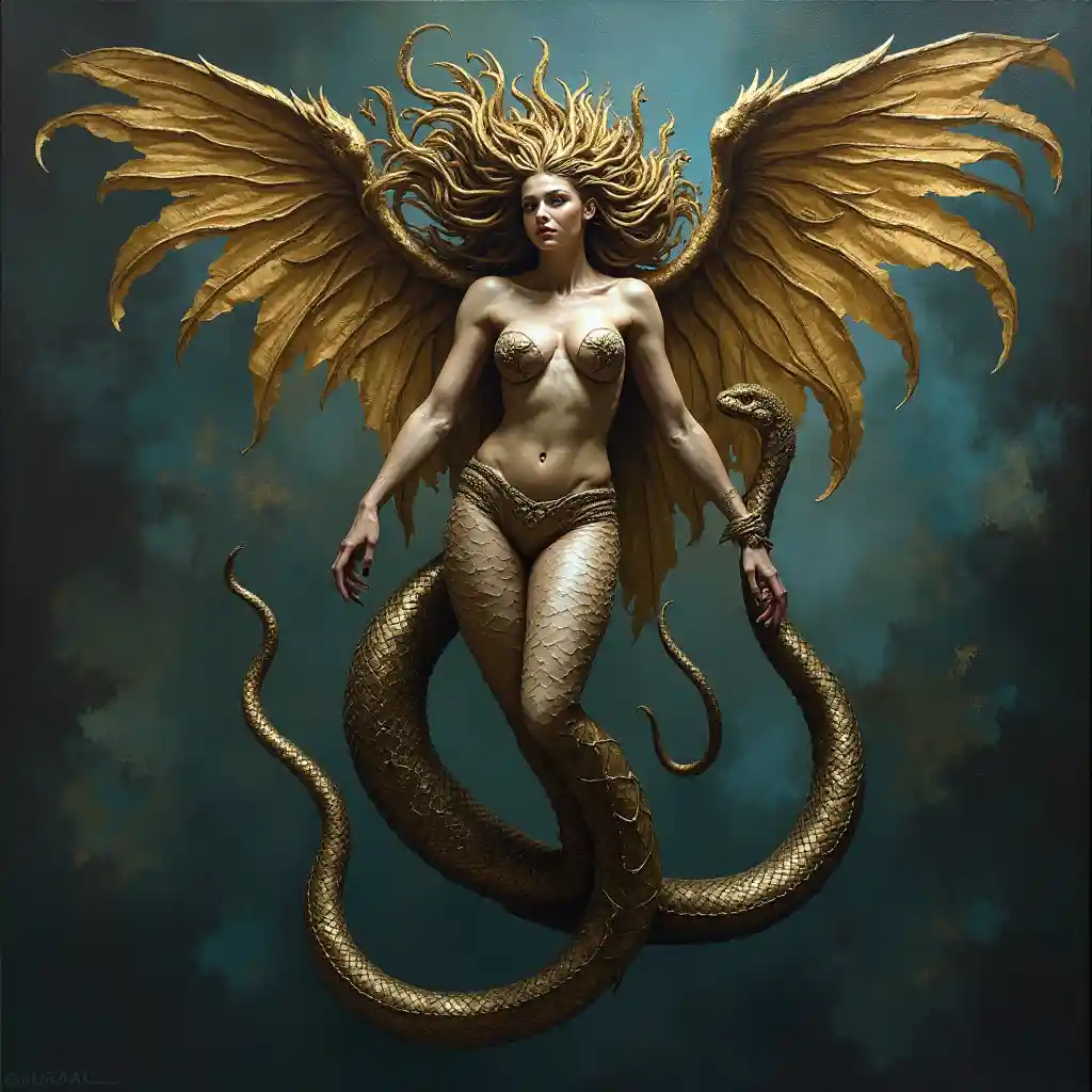 غورغون الساحرة والخلافة ، تنزلق بأناقة على ذيل الثعبان ، شعرها هو عش الثعبان الحي ، ملامح الساعة الرملية التي لا تشوبها شائبة مزينة بمقاييس لامعة ، مخالب معدنية حادة مدببة من البرونز ، ريش ذهبي لامع على الأجنحة ، فائقة الواقعية مع ضربات معبرة ، نسيج ، تلتقط طبيعة الطبيعة ، لوحة خيالية مظلمة غنية ، جماليات مظلمة ، تقدم في لوحة زيتية على قماش عالي الجودة ، العمل المرموق ذو الإصدار المحدود ، الحائز على جائزة ، يجسد النسبة الذهبية ، ويستحضر تجربة رباعية الأبعاد ، من قبل ويل موراي ، بدون أرجل ، بدون توقيع ، غير ممل أو عادي أبدًا ، يتجنب التفسيرات المجردة.