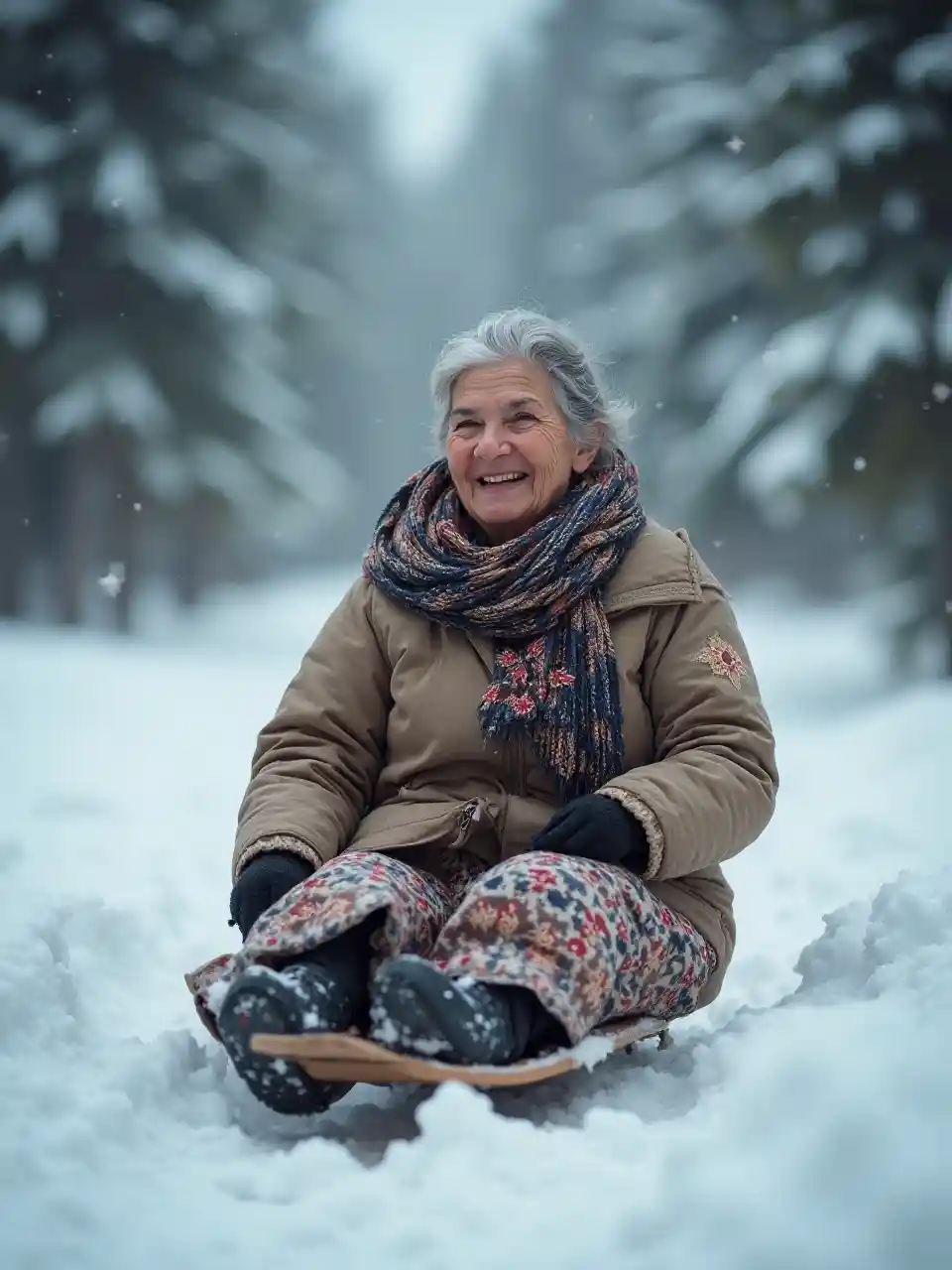 أثناء ركوب الزلاجات في الغابة المغطاة بالثلوج ، ترتدي امرأة من الشرق الأوسط تبلغ من العمر 73 عامًا معطفًا مطرزًا بالثلج. تأطرها أشجار الصنوبر المتجمدة والنجوم المتلألئة ، وتنضح زلاقاتها السريعة بالبهجة ولذة الشتاء في مشهد هادئ وطبيعي. ضحكتها تدفئ البرد..