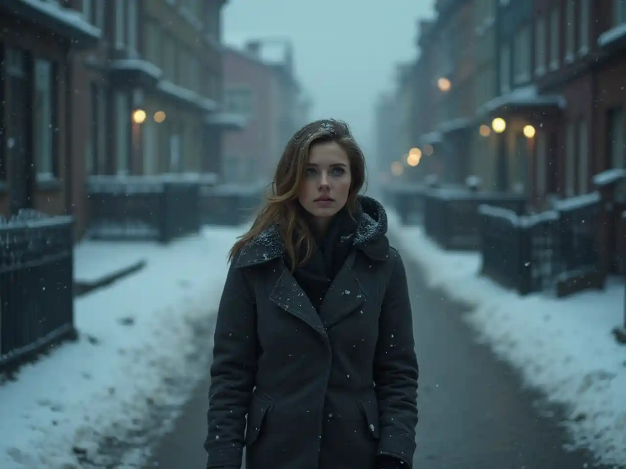 امرأة وحيدة تسير في شارع فارغ مغطى بالثلوج في يوم شتاء بارد. كان الشارع باردًا ، وكانت المباني مضاءة بأضواء خافتة. تبعتها الكاميرا وسقطت الثلوج برفق لتركز على وجهها المليء بالحزن والحنين. كانت ترتدي معطفاً شتوياً كثيفاً ، وكانت تسير ببطء ، وعيناها تغرقان في التأمل. كان الجو يشعر بالبرودة والكآبة ، مما يعكس حالتها العاطفية.