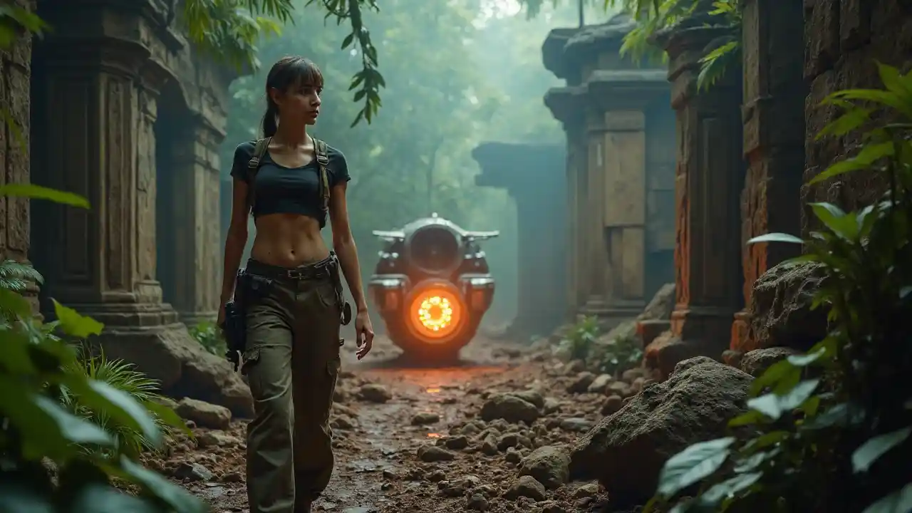 একটি আকর্ষণীয় ছবিতে একটি পাতলা মহিলার চিত্রিত করা হয়েছে যার ত্বককে সংজ্ঞায়িত করে এবং ছোট বৈশিষ্ট্যগুলি, একটি শক্ত এক্সপ্লোরার পোশাকের সাথে একটি দীর্ঘ মালবাহী প্যান্ট এবং একটি ফিট টি-শার্ট, তার পেট একটি ঝলক প্রকাশ করে। ঘন জঙ্গলের গভীরে অবস্থিত প্রাচীন ধ্বংসাবশেষের মধ্যে তার খননের কাজের মাঝখানে, তিনি একটি রহস্যময় বহিরাগত ইঞ্জিনের উপর ঠেকিয়েছিলেন। ইঞ্জিনটি স্বতঃস্ফূর্তভাবে একটি প্রাণবন্ত, রঙিন আলোক নির্গত করতে শুরু করে। নাটকীয় আলো দৃশ্যকে উন্নত করে, গভীরতা যোগ করে এবং 10k রেজোলিউশনে প্রতিটি জটিল বিবরণকে তুলে। আলোর এবং ছায়ার গতিশীল খেলা আবিষ্কারের রহস্যময় এবং ভীতিকর পরিবেশকে জোর দেয়।