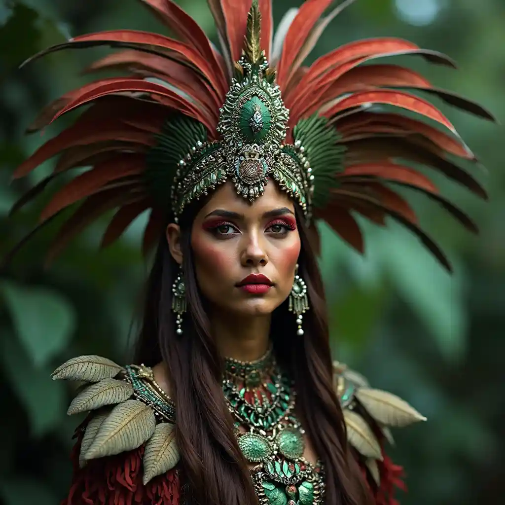 অ্যামাজনকে প্রতিনিধিত্ব করে একটি ব্রাউন ত্বকের আদিবাসী মহিলা, সবুজ এবং লাল এবং রূপালী বিশাল হেডপিসের মাঝখানে, লাল/সিলভার মেকআপ, লম্বা পাখির পালক দিয়ে বড় মাথা, ক্ষেত্রের গভীরতা, অসাধারণ তীক্ষ্ণ এবং রাজকীয় থিমযুক্ত পোশাক, প্রাণবন্ত রং মধ্যে বন্দী, ফ্যান্টিসি, ন্যূনতম