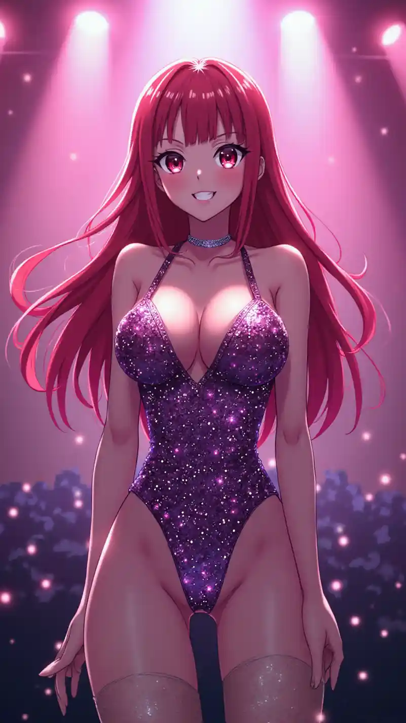 আল্ট্রা এইচডি অ্যানিম মেয়েটির উল্লম্ব বড় আকারের চিত্র, চমকপ্রদভাবে সুন্দর এবং গতিশীল, মঞ্চের আলো দ্বারা আলোকিত, একটি গভীর ঘাড় এবং মাছের জালের জোতা সহ একটি চকচকে পারফরম্যান্স পোশাক পরে, তার লম্বা চুল ধ্রুবক এবং একটি আত্মবিশ্বাসী হাসি, বড় ঝলকানি চোখ, জ্বলন্ত ত্বক, প্রাণবন্ত গোলাপী এবং বেগুনি রঙের প্যালেট, ধারালো বৈশিষ্ট্য, সাহসী মেকআপ, শক্তিশালী এবং গ্ল্যামার, একটি নরম গ্ল্যামার সঙ্গে গতিশীল আলো, তার আকর্ষণীয়, সুনির্দিষ্ট বুকের সাথে একটি সুক্ষর ক্লিট, এবং একটি গতিশীল পোজ সঙ্গে দীর্ঘ, টোন ক্যারিমা এবং আকর্ষণীয়।