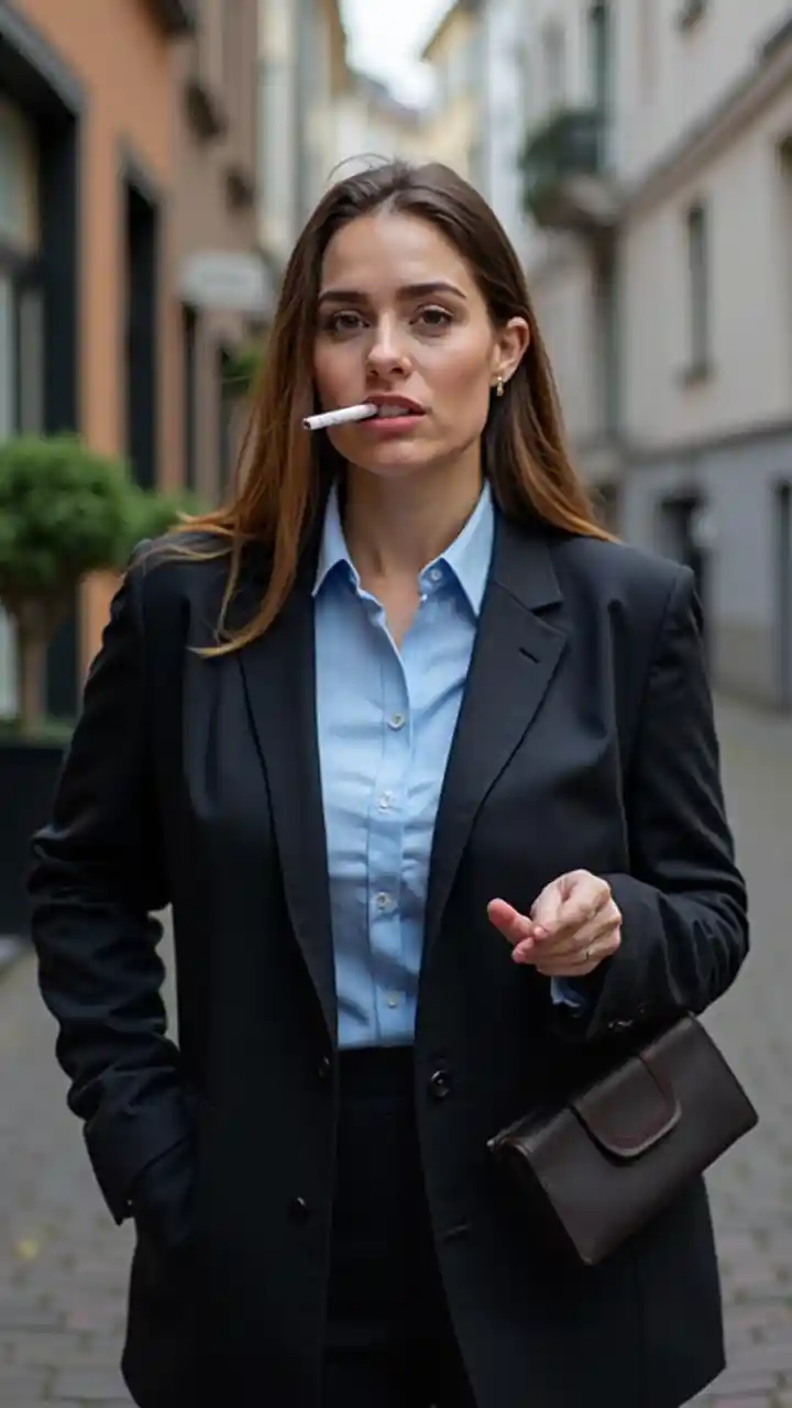 আরব মোটা ওজনের মহিলা কালো ব্যবসায়িক পোশাক পরে আছে সাধারণ হালকা নীল বোতাম নিচে কলার শার্ট নীচে ব্লেজার অফ স্যুট বন্ধ বাইরে সিগারেট এবং ওয়াইন পান