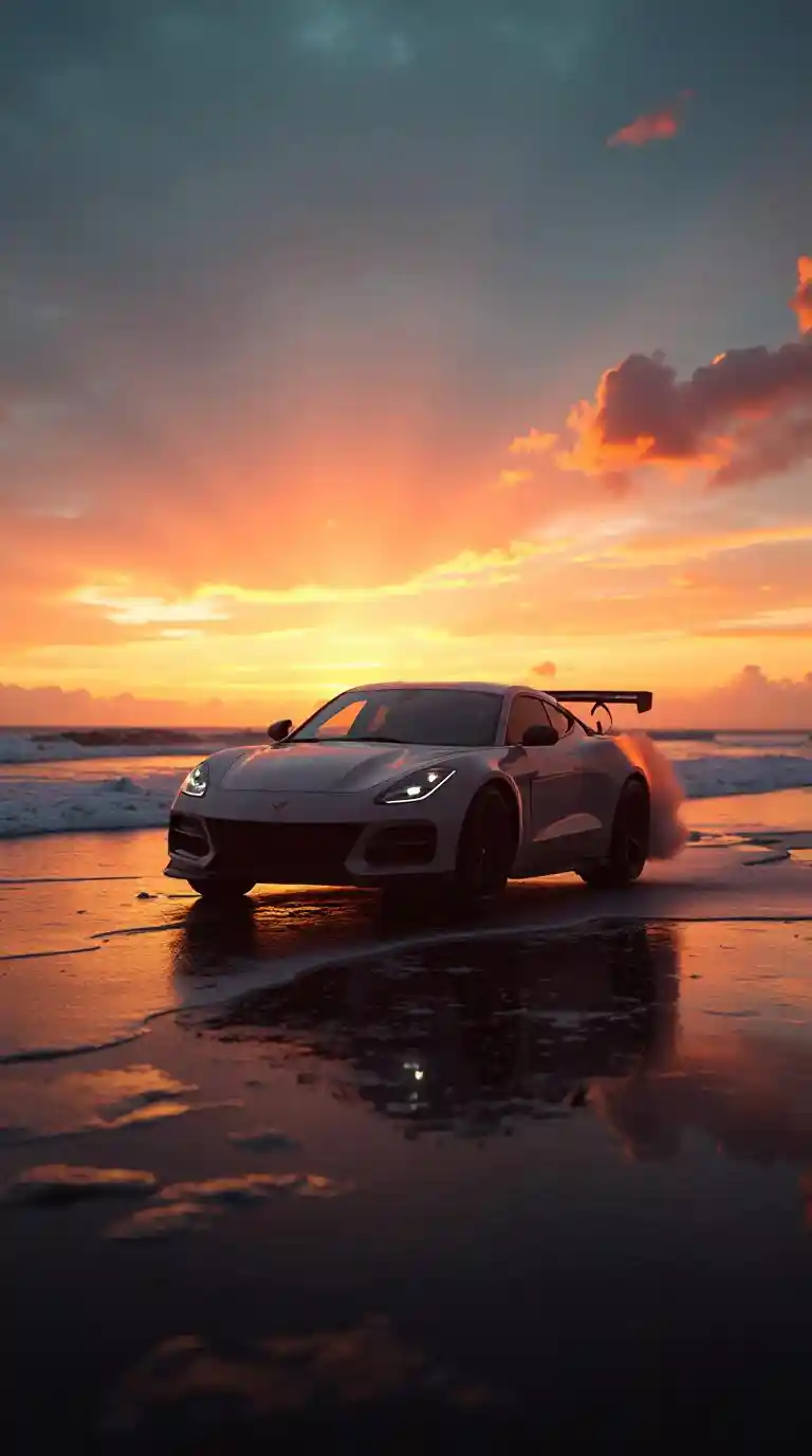 মোশন ব্লুর সহ সূর্যাস্তের সময় সৈকতে গাড়ি