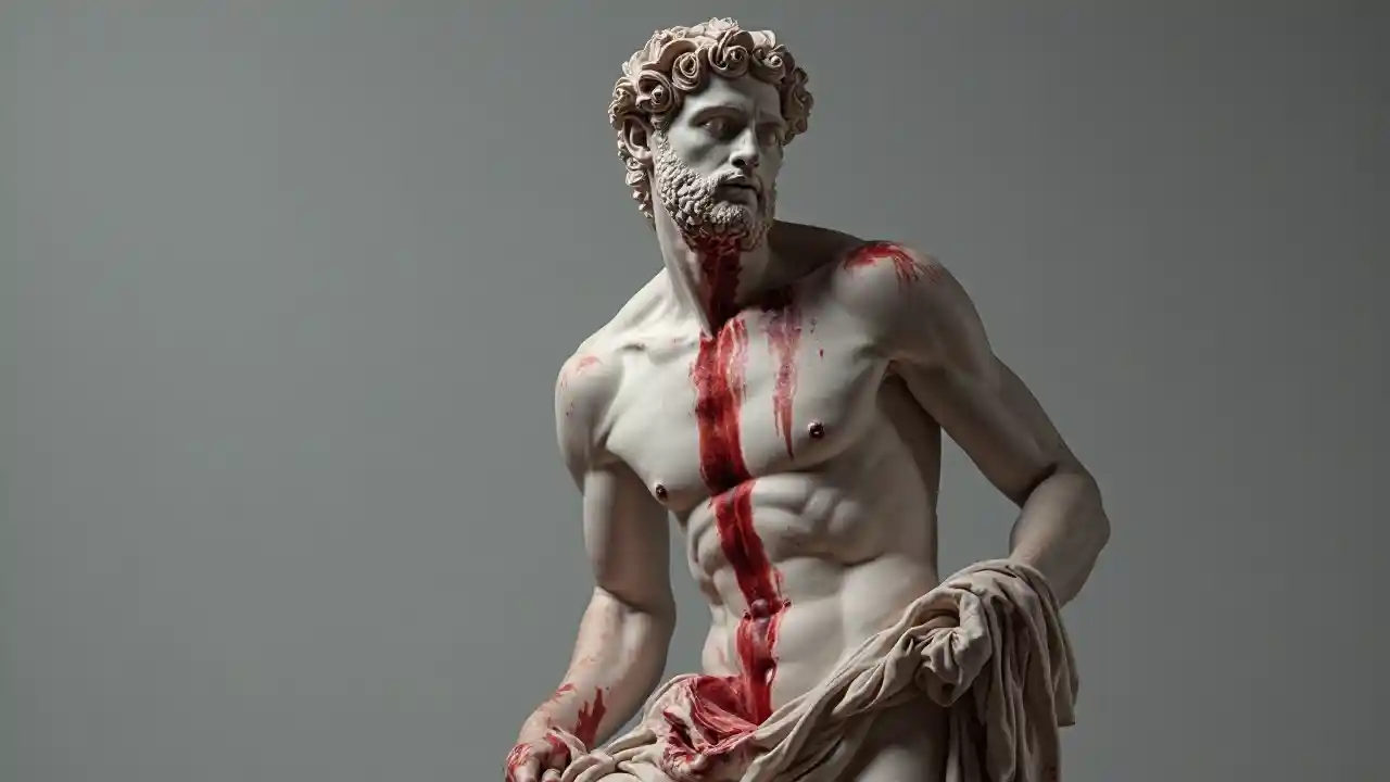ধূসর পটভূমিতে রক্তাক্ত গ্রীক মূর্তি