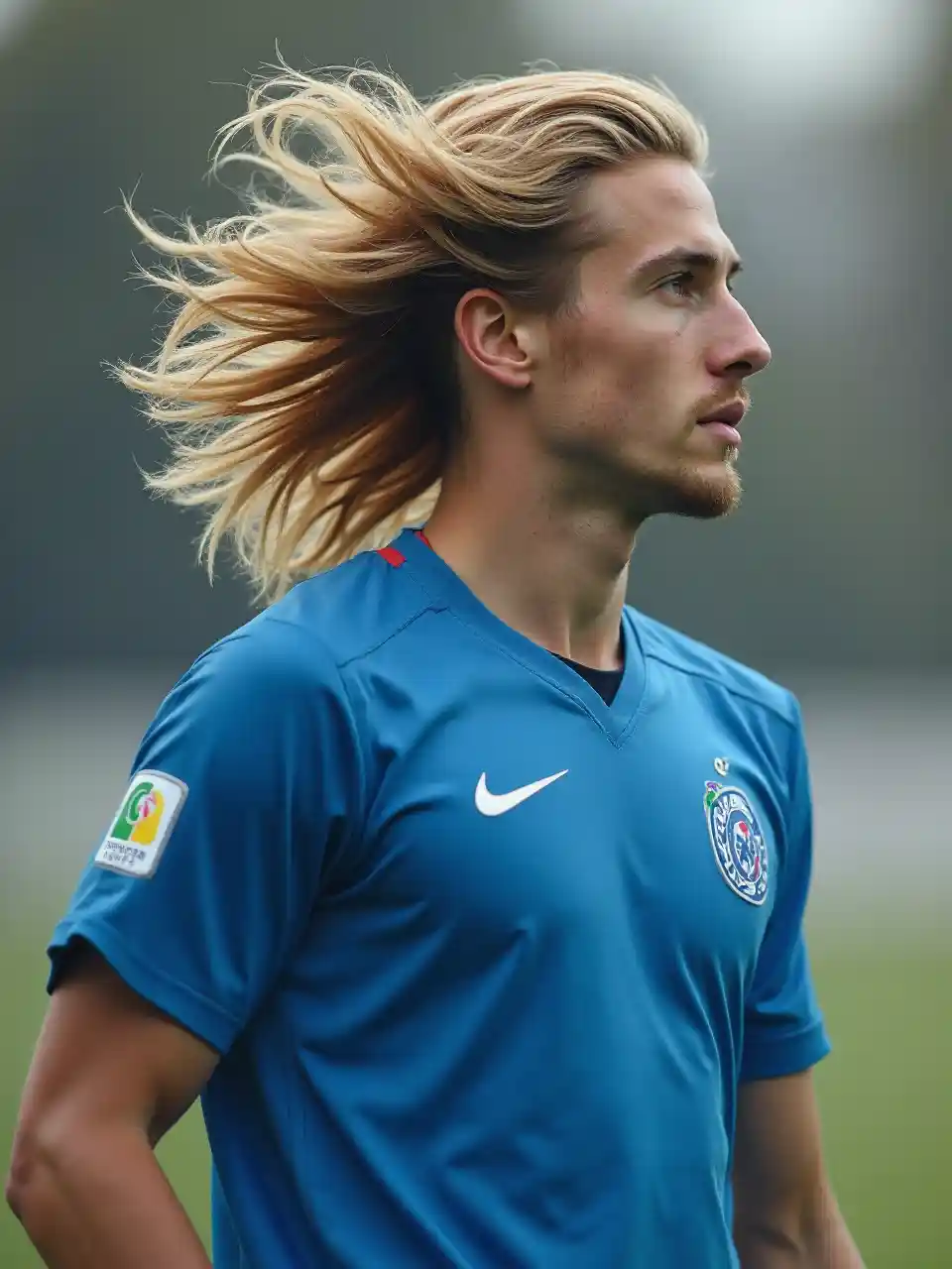 নীল টি-শার্ট সঙ্গে ফুটবলার স্বর্ণকেশী বায়ু