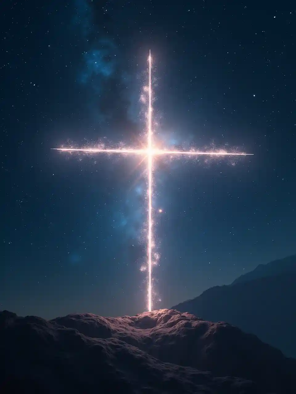"রাতের আকাশে একটি অত্যাশ্চর্য, স্বর্গীয় দৃশ্য, যেখানে ওরিয়ন নক্ষত্রের তারাগুলি একটি ধর্মীয় ক্রস গঠন করতে উজ্জ্বল, এবং লাইন দ্বারা সংযুক্ত করা হয়। ওরিওনের তারকাদের - বেটেলজিউজ, রিগেল, বেল্যাট্রিক্স এবং সাইফ - মূল পয়েন্ট হিসাবে তুলে ধরা হয়েছে, তাদের উজ্জ্বল, পৃথক উজ্জ্বলতা অন্ধকারের মধ্য দিয়ে ছড়িয়ে পড়ে। ক্রসটির উল্লম্ব রেখাটি বেটেলজিউস এবং রিগেল দ্বারা গঠিত, যখন অনুভূমিক রেখাটি বেল্যাট্রিক্স এবং সাইফ দ্বারা গঠিত হয়, আকাশে একটি ক্রস-আকার তৈরি করে। পটভূমি হল বিশাল, নক্ষত্রবিশিষ্ট আকাশ, যা মেঘ এবং মহাজাগতিক ধুলো দিয়ে, দৃশ্যটিকে একটি রহস্যময়, ঐশ্বরিক বায়ুমণ্ডল দেয়। ক্রসকে আধ্যাত্মিক এবং অন্য জগতে অনুভব করতে হবে, তারকা এবং ক্রস গঠনকারী আন্তঃসংগ লাইনগুলিকে আলোকিত করে একটি নরম, জ্বলন্ত আলো দিয়ে।
