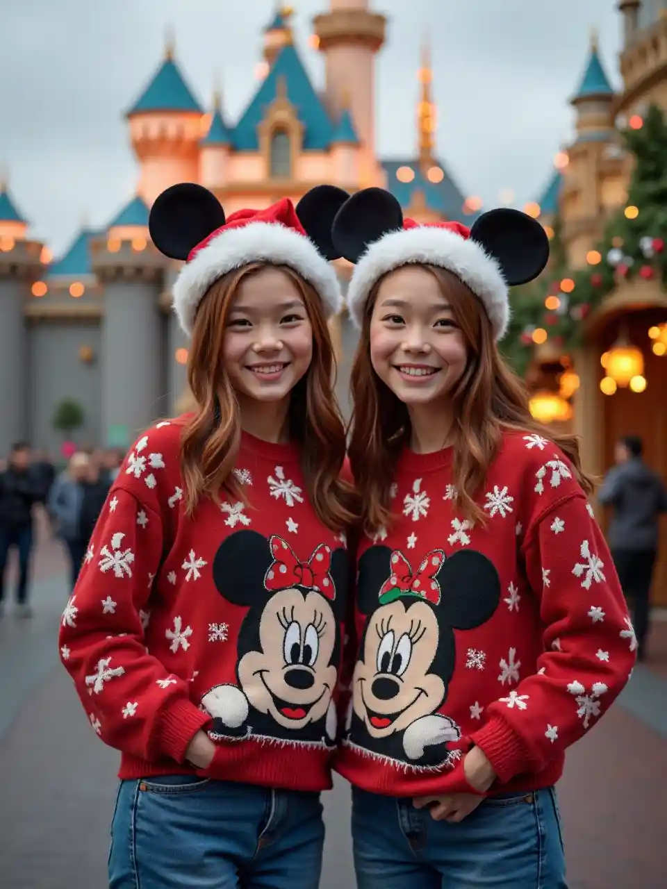 ছবির বাস্তবতা, (অসাধারণ সুন্দর কিশোরী এশিয়ান-আমেরিকান বোনদের বয়স ১৫-১৭) ক্রিসমাসের ছবির জন্য পোজ, কাস্তেনা-অব্রেন চুল, (অদ্ভুত ক্রিসমাস সোয়েটার এবং জিনস), মিকি মাউস টুপিগুলি (পল ওঠানো বুকের ঘন শরীর), ডিজনিল্যান্ড ক্যাসেল ছুটির জন্য সজ্জিত, উষ্ণ আনন্দ, উচ্চ বিস্তারিত মুখ, 8k, প্রো ফটোগ্রাফি, প্রো আলো, উদযাপন সজ্জিত অতি-বিস্তারিত পরিবেশ, আরামদায়ক পরিবেশ, আনন্দদায়ক অভিব্যক্তি।