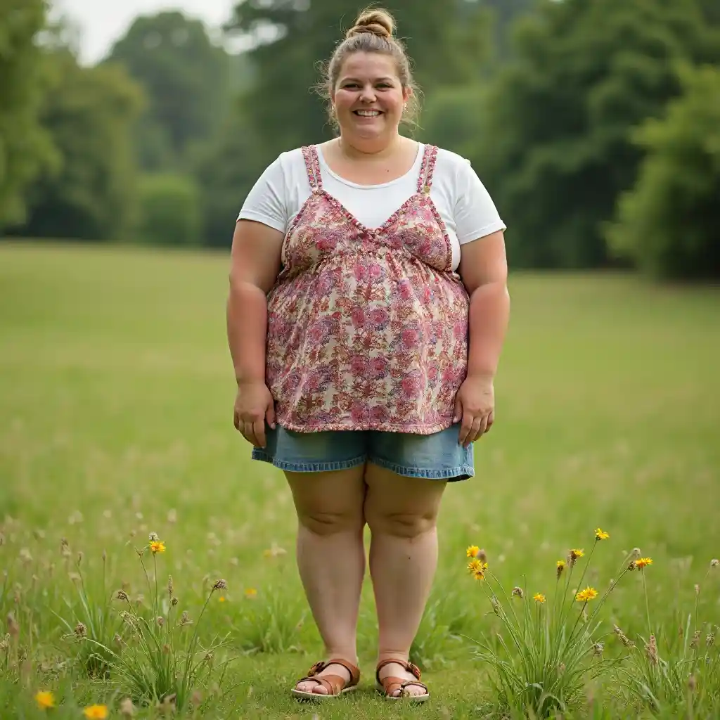Braydenপূর্ণ আকৃতির, অতিরিক্ত ওজন এবং খুব chubby, XXL, 40 বছর বয়সী সাদা ইউরোপীয় মোটা মহিলা, সমতল স্যান্ডেল, চারা উপর দাঁড়িয়ে