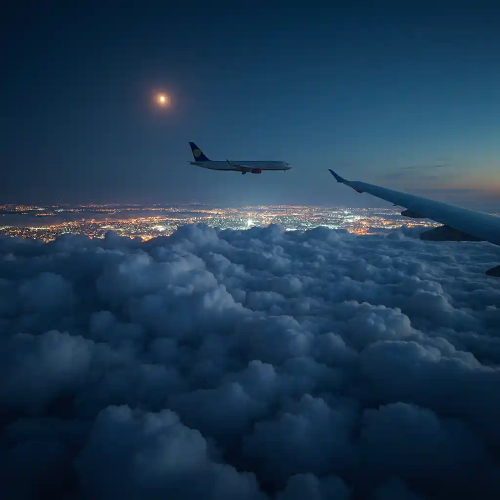 রাতের ফ্লাইট: শহরের মেঘের উপরে উড়ন্ত একটি বিমান