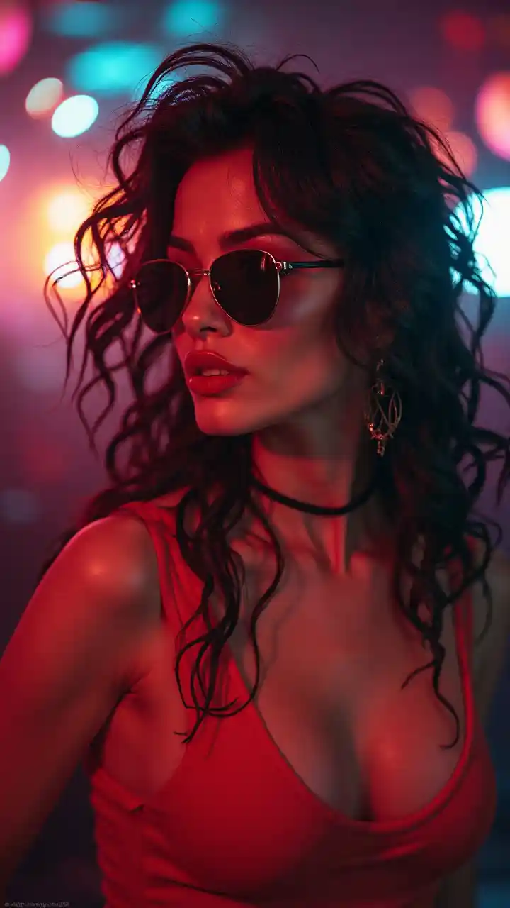 ৮০ এর দশকের ডিস্কোতে এক মহিলার ছবি, সে সানগ্লাস পরেছে, রেট্রো ফাঙ্ক আর্টের স্টাইলে, ডিস্কো থিম, অ্যানি লাইবভিট, বন্য এবং সাহসী, আইকনিক অ্যালবামের কভার, প্রাণবন্ত আন্দোলন, চূড়ান্ত বাস্তবতা, --ar 53